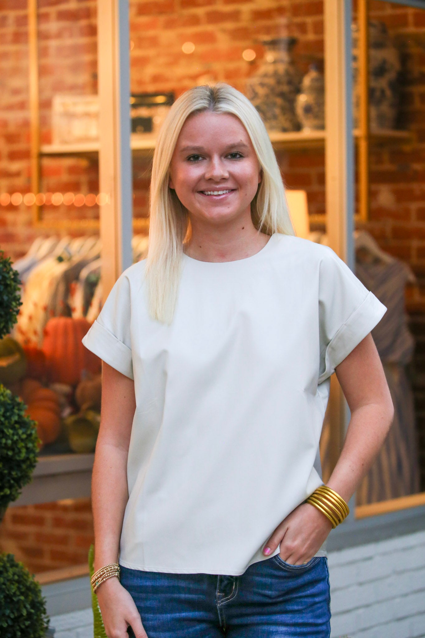 Leather Cap Sleeve Top- Oyster