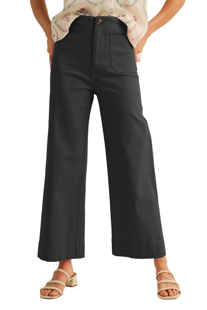 Create an effortlessly laidback look with these cropped wide leg pants! Stretchy and sturdy fabric shapes these ultra cool pants that have a high-waisted fit with a zipper and button closure. The wide legs have front and back patch pockets to add a utility element. Pants end at cropped length.