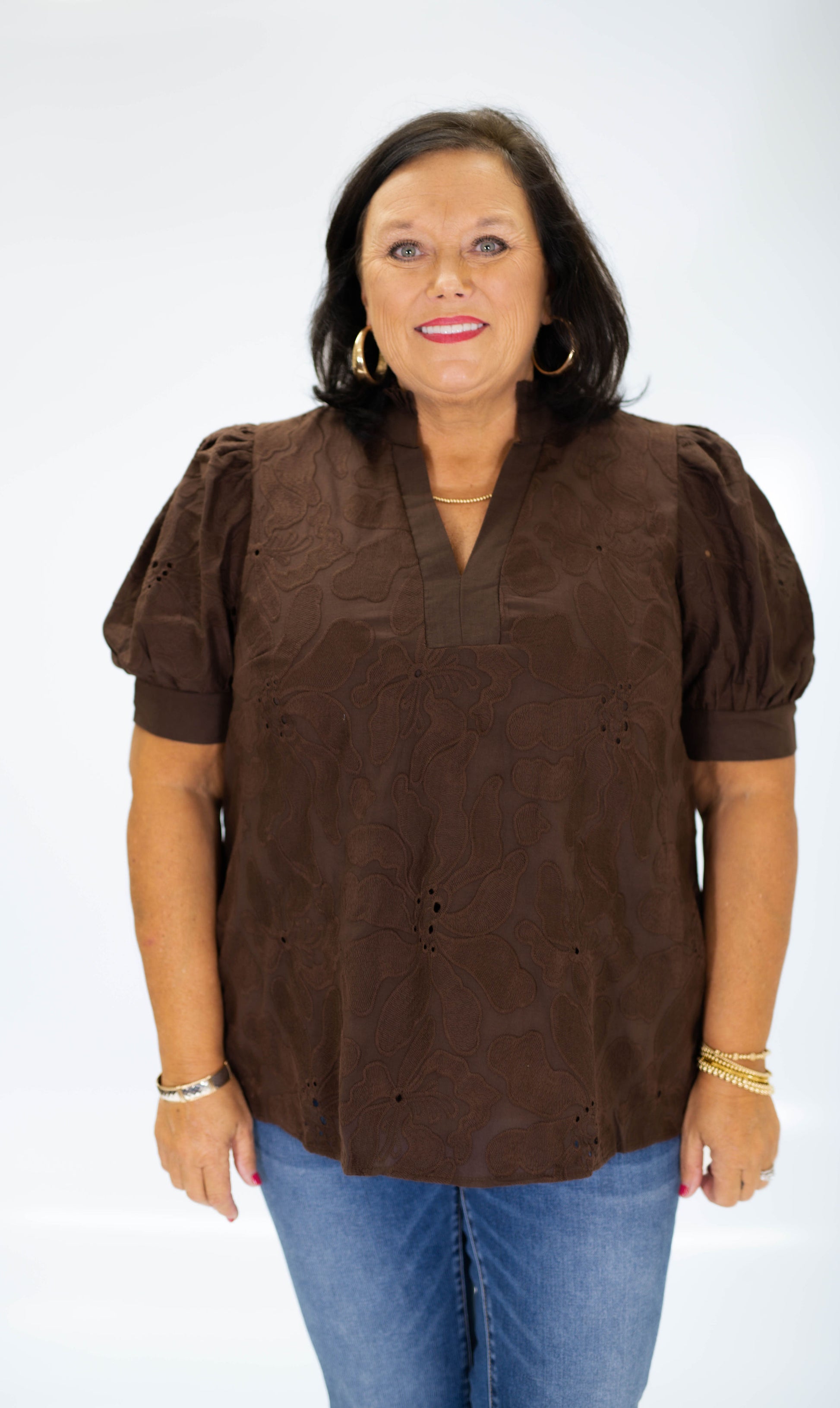Floral embroidered short puff sleeve pullover top featuring pleated band collar split V-neck. Lined. Woven. Non-sheer. Lightweight.