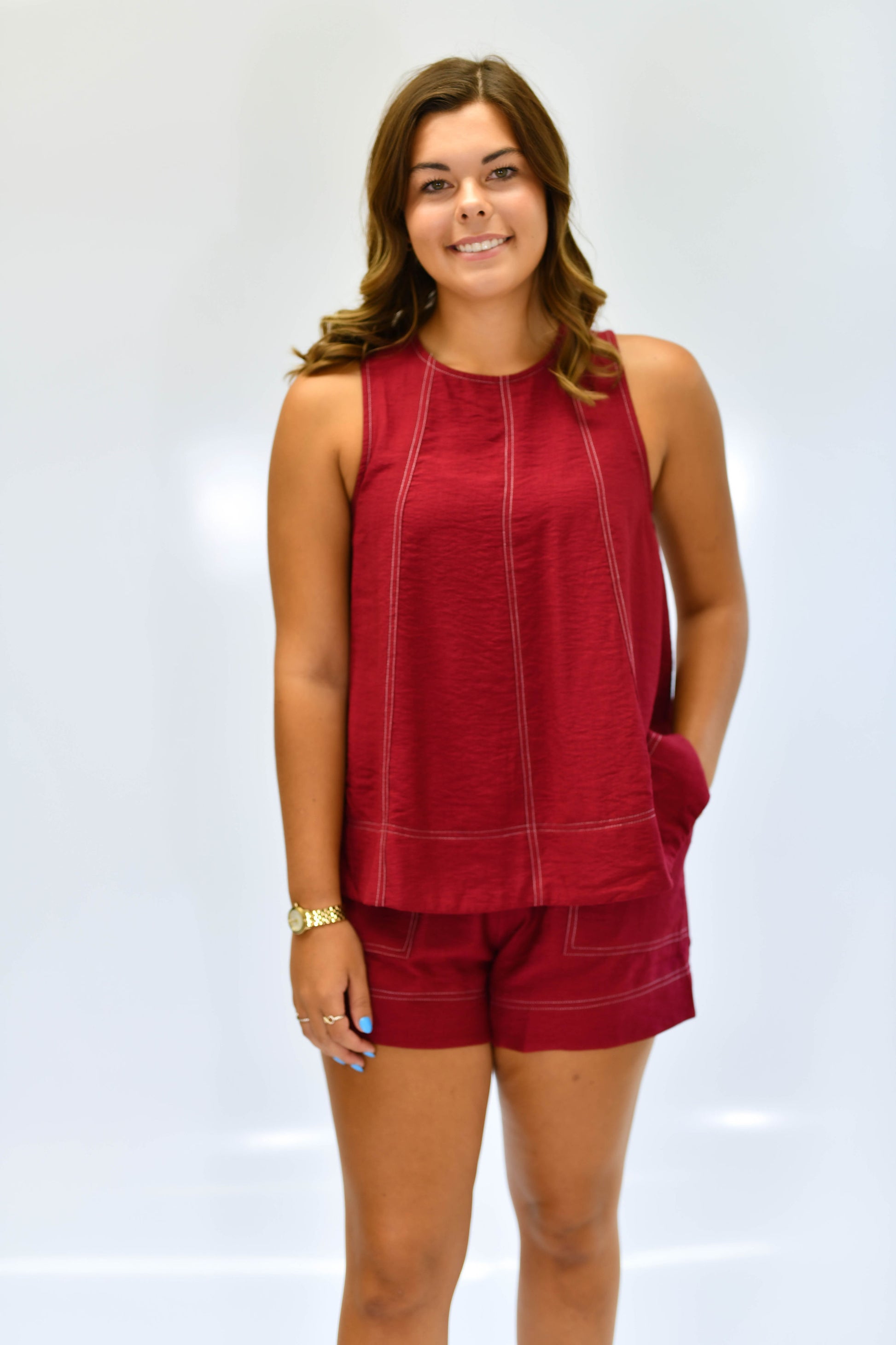 Solid sleeveless pullover top and Shorts featuring contrast accented exposed stitching. Single button keyhole closure at back. Unlined. Woven. Non-sheer. Lightweight.