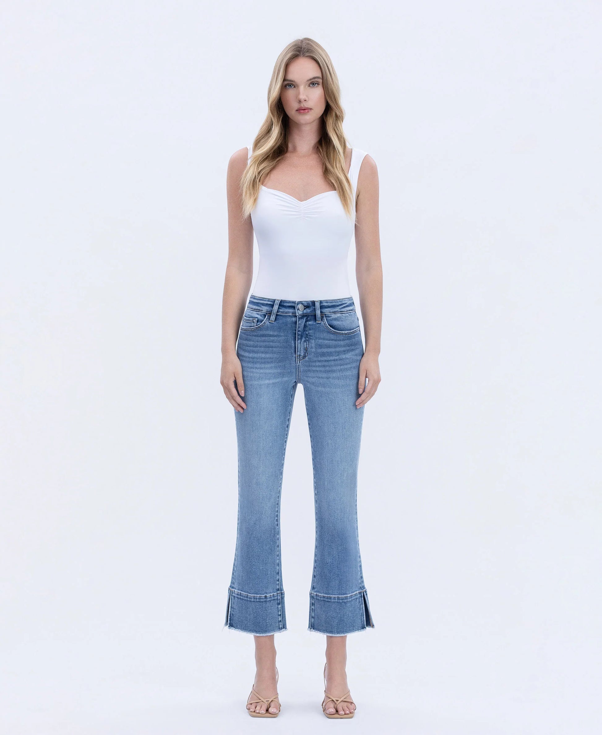 These denim jeans bring a fresh twist to a timeless classic. Designed in a flattering mid-wash blue, they feature a high-rise fit with slight fading and whiskering for that perfect lived-in look. The standout detail is the cropped flare hem with layered seam accents and raw edges, giving them a playful, modern vibe. Pair them with heels for a chic night out or keep it casual with sneakers and a tee. A versatile pair that effortlessly blends everyday comfort with on-trend style.