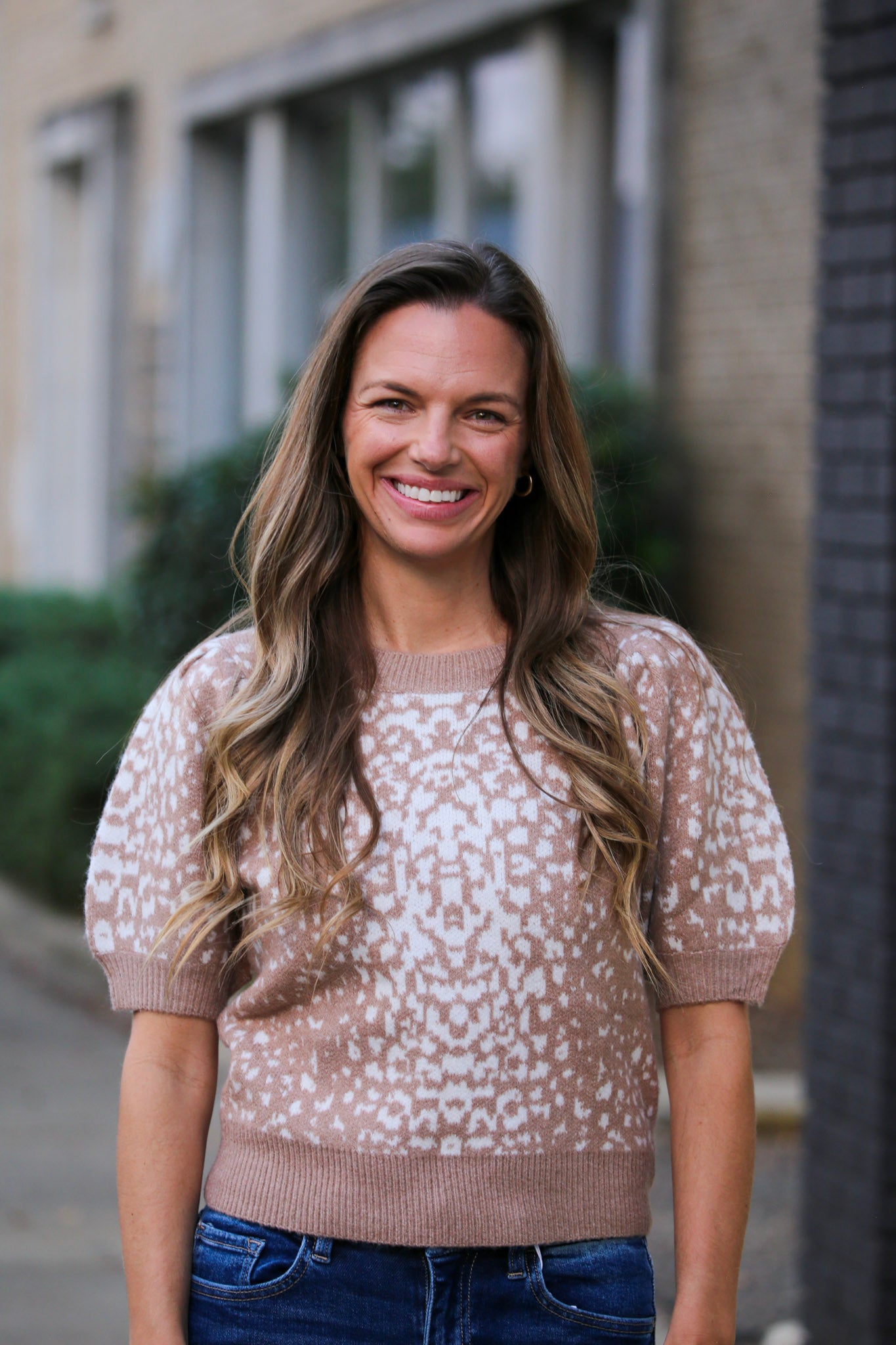 Animal pattern short puff sleeve sweater knit pullover top. Unlined. Knit. Non-sheer. Lightweight.